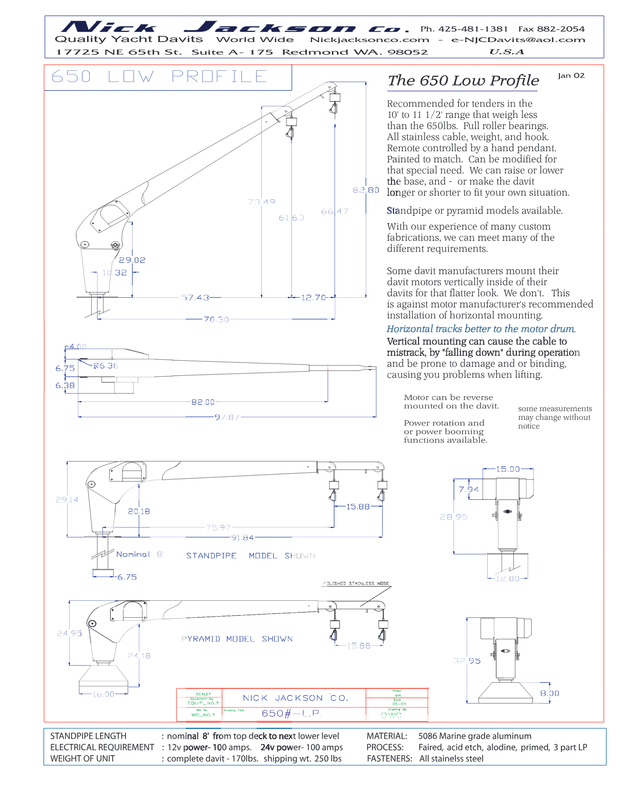 The Nick Jackson Co. 600lb Low Profile Davit system is a practical and durable solution for managing small watercraft, providing a balance between strength, compact design, and user-friendly operation, perfect for recreational boaters and yacht owners.