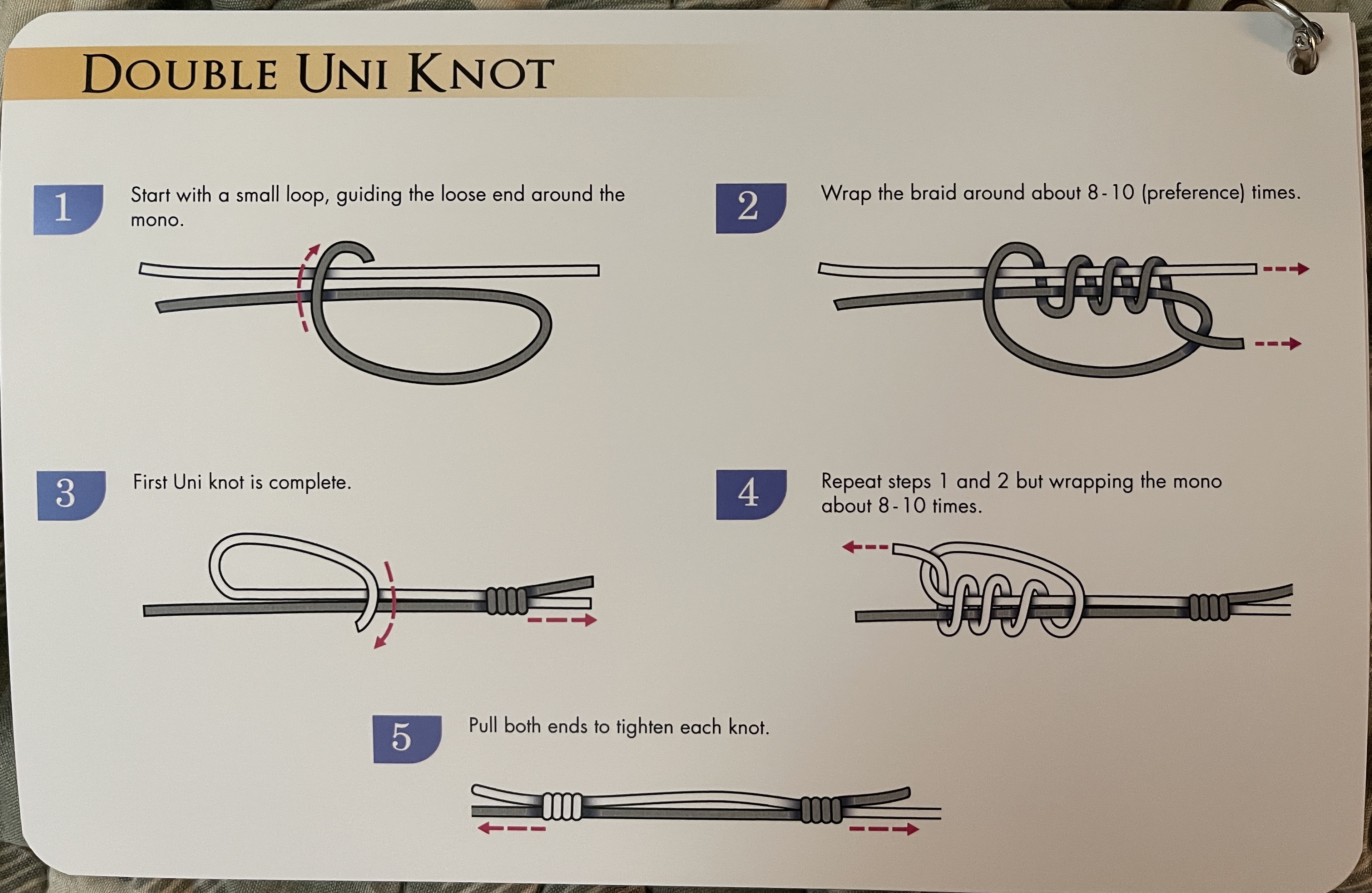 The Double Uni Knot is a versatile and reliable knot used to connect two fishing lines of similar or different diameters and materials. It is particularly popular for its ease of tying and strong, dependable hold.